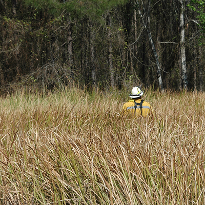 Photo of natural resources fire fighter among dry cogongrass which posses a huge fire hazard.